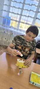 Ребята с увлечением наклеивали цветные листочки жёлтого цвета на спинку ежа. В результате получились яркие и красивые ежи.