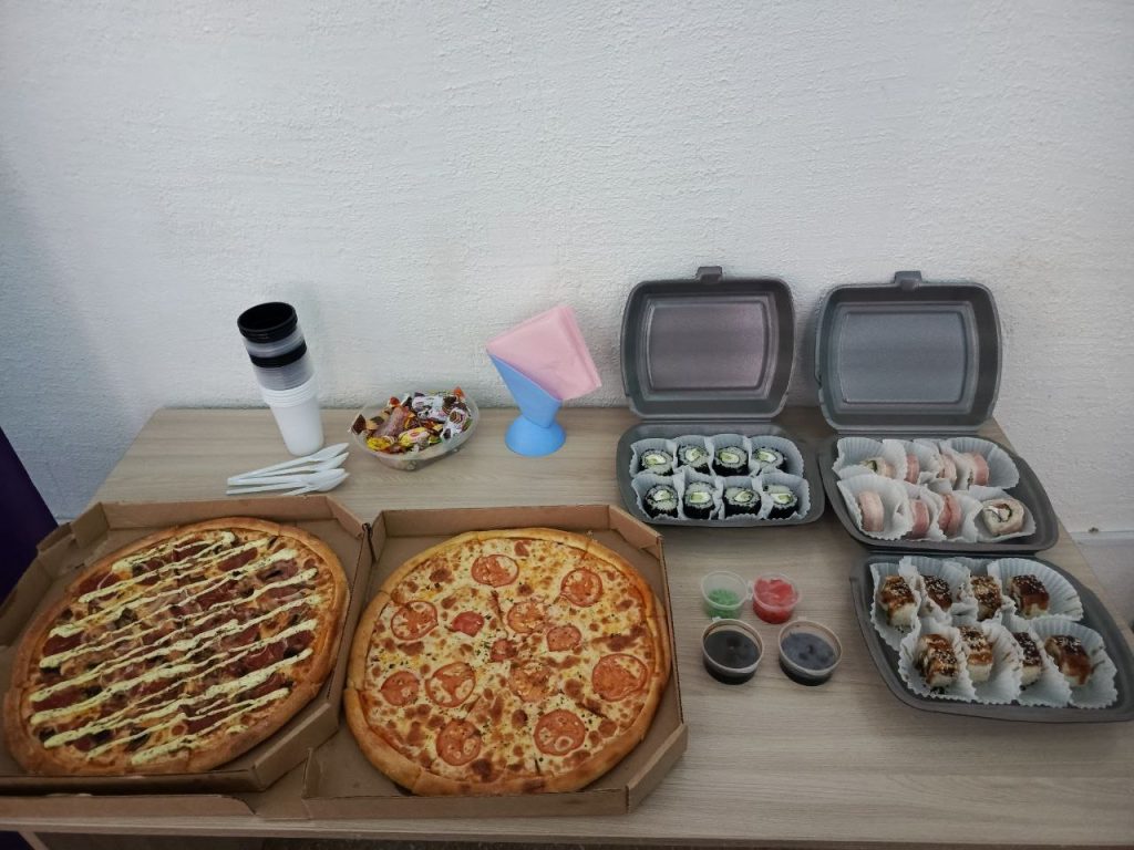 Приятным сюрпризом оказались угощения для волонтеров. Был организован чайный стол. Спонсоры мероприятия, компания SUSHI VIBE угощали волонтеров вкусной пиццей и сушами.