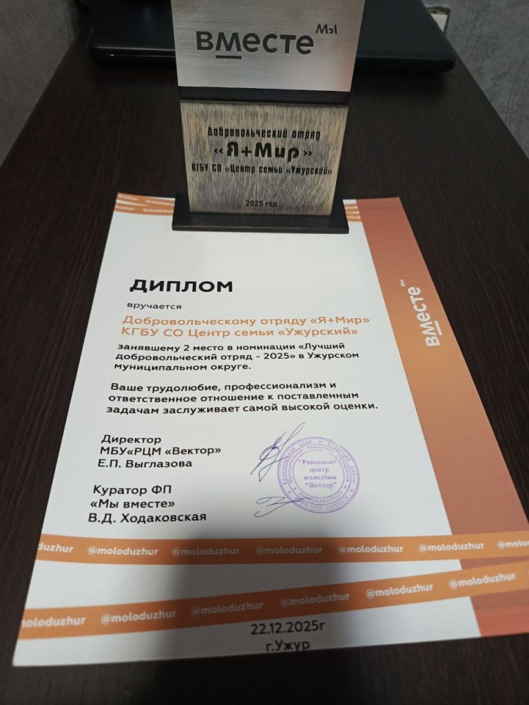 2 место в номинации «Лучший добровольческий отряд 2025 года» получил Добровольческий отряд «Я+Мир» КГКУ СО Центр семьи «Ужурский»