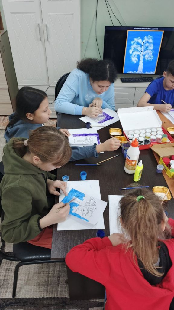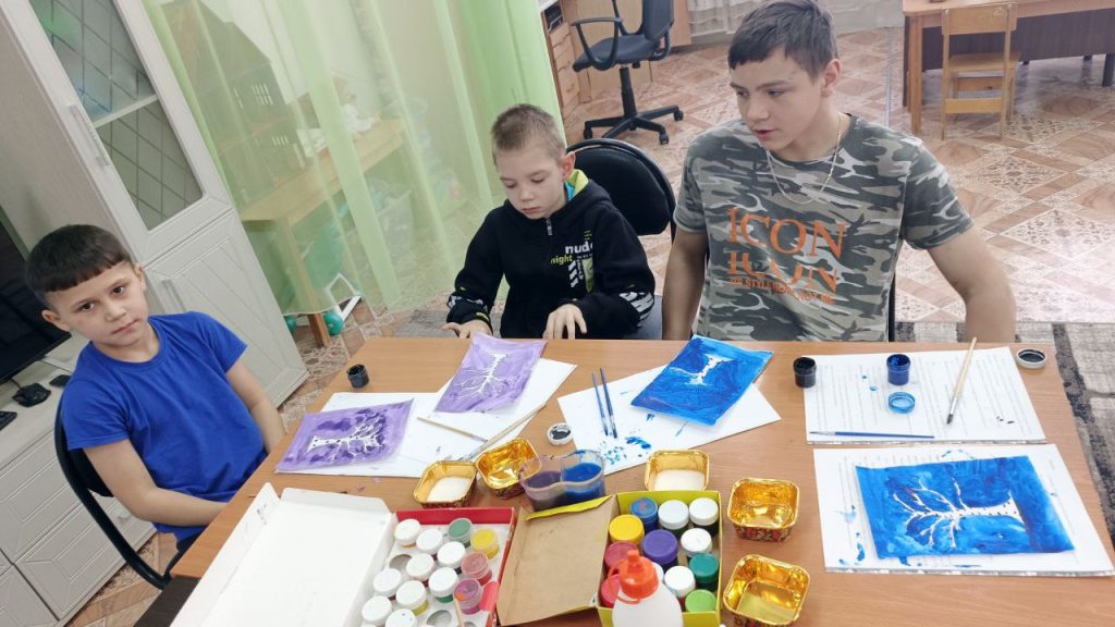 В этом может помочь замечательная техника по созданию картин из соли. Ребята сначала сделали наброски будущих деревьев, затем они закрасили фон картины. И только потом нанесли клей и посыпали солью каждый элемент. Раскрашивать было очень сложно, так как соль прилипала к кисточке, как сыпучий снег. Это не помешало творческому порыву всех участников мероприятия.