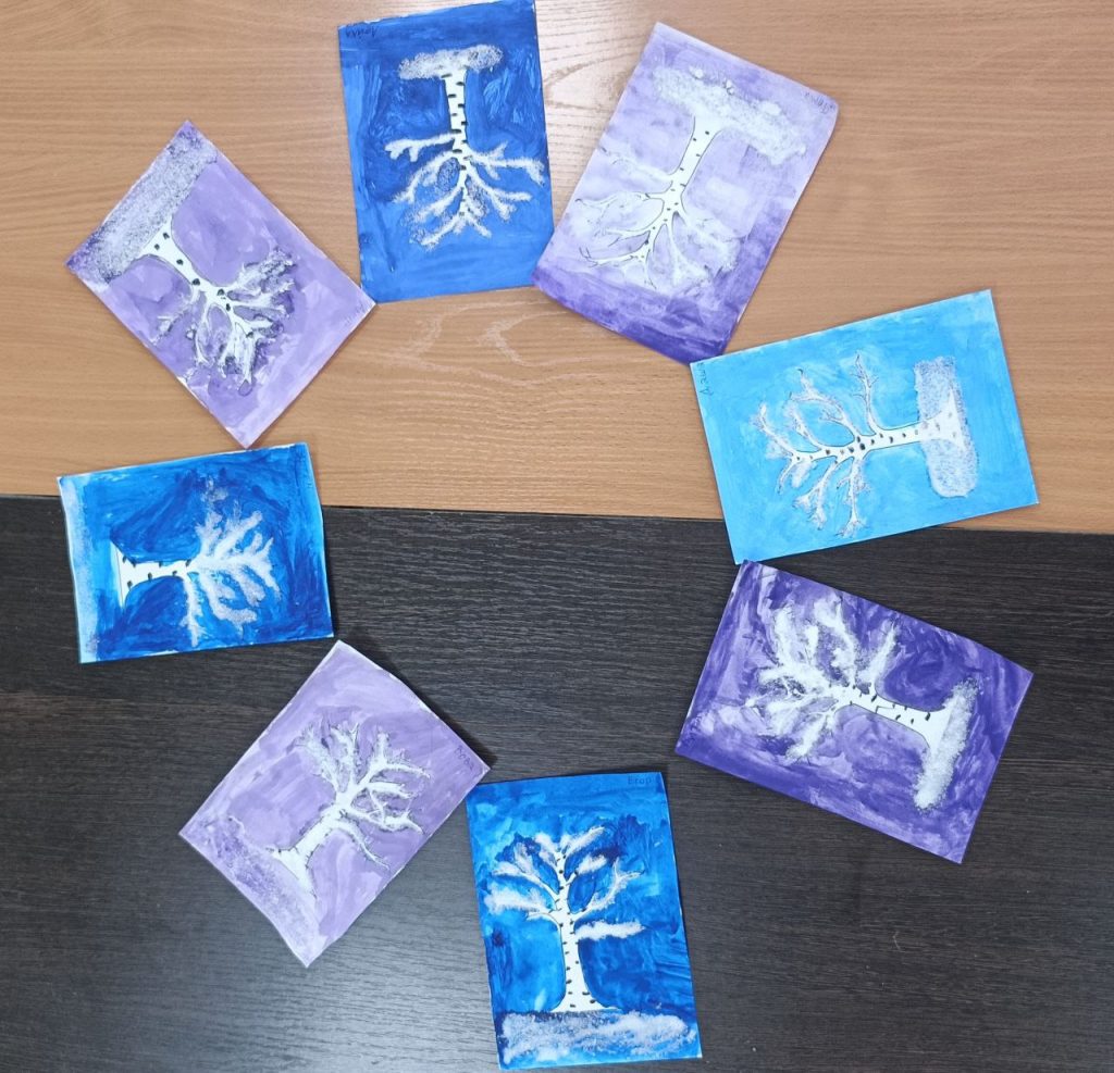 Работы получились удивительными, ведь соль и клей позволяли создавать объём и размытость, от этого картины кажутся пушистыми, как лёгкий снег. Все работали вдохновенно и настойчиво. Результатом стали замечательные картины, хранящие тайну зимы.