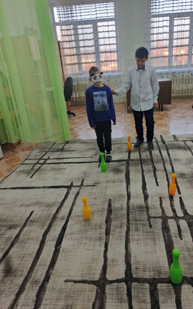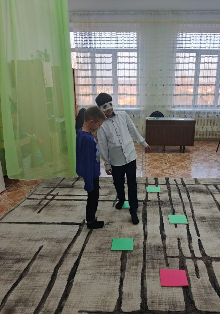 После успешного выполнения заданий, ребята поиграли в игру «Вслепую через лабиринт», где ребятам вслепую нужно было пройти через лабиринт, опираясь на помощь и подсказки ребят.