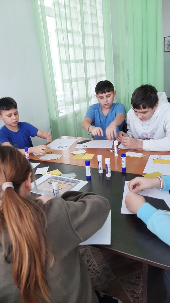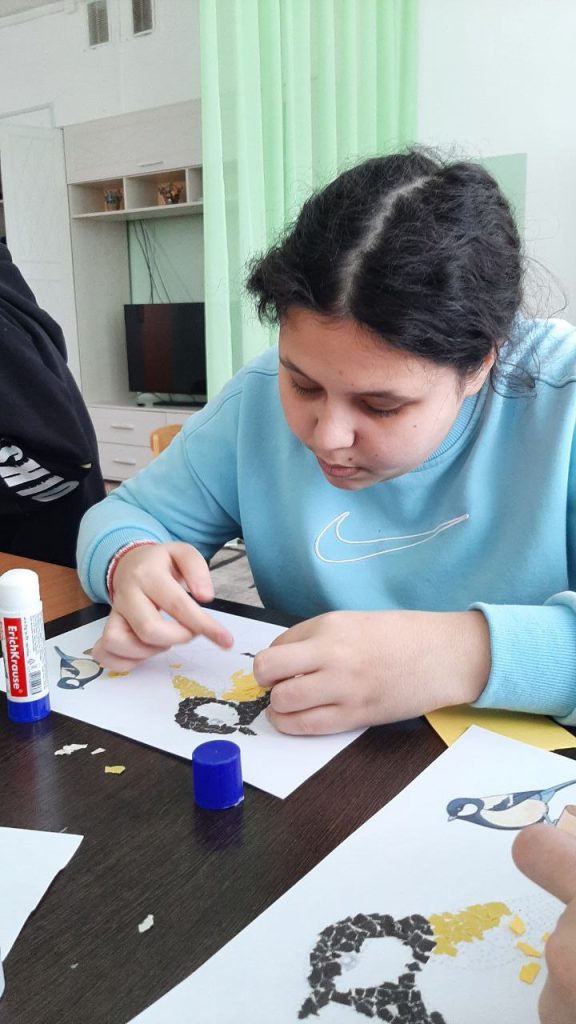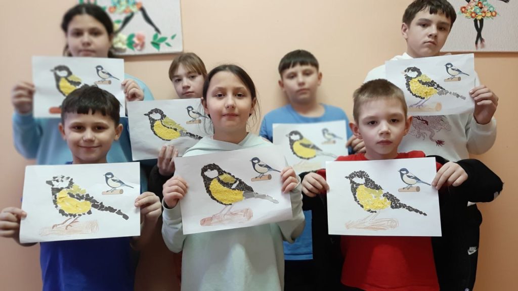 Следующим этапом стало практическое задание. Воспитанникам предоставили цветную бумагу, клей и ножницы. Ребятам предложили воссоздать образ озорной синицы, используя технику обрыва небольших кусочков цветной бумаги и последующего приклеивания их на основу. Работа шла весело и увлечённо.