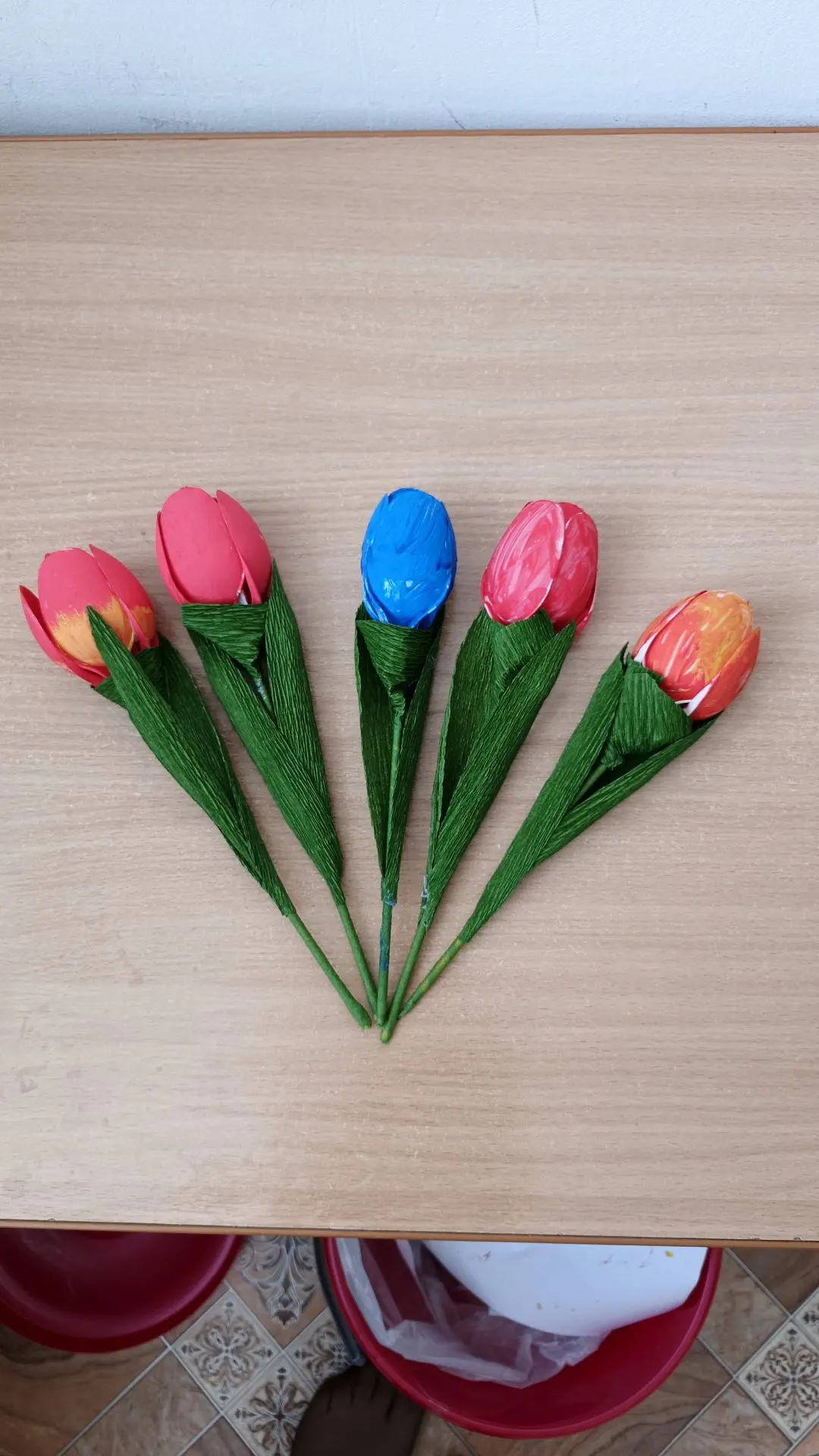 За основу взяли пластиковую ложку и гофрированную бумагу, которая путем простых, незатейливых движений превращалась в лепесток тюльпана. Эта работа потребовала от ребят усидчивости, терпения и аккуратности. Но это стоило того! Лепесток за лепестком обыкновенная пластиковая ложка превращалась в бутончик тюльпана! Оставалось только сделать стебель с листочками, и вот наш тюльпан готов! А если постараться и сделать несколько таких бутонов, то можно легко собрать красивый букет из неувядающих тюльпанов. Такие букетики можно вручать друзьям и близким в качестве подарков.