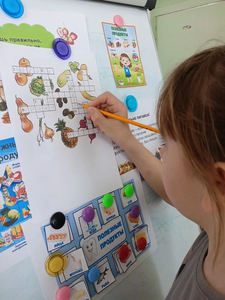 Свои знания дети закрепили в ходе дидактической игры «Полезная и вредная еда», разгадали витаминный кроссворд. Ребята с удовольствием отгадывали » вкусные » загадки о полезных продуктах.