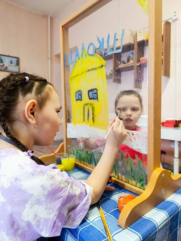 - Ребёнок не может спрятаться за листом — он видит комнату и лица окружающих сквозь свой рисунок. Это снижает тревожность.